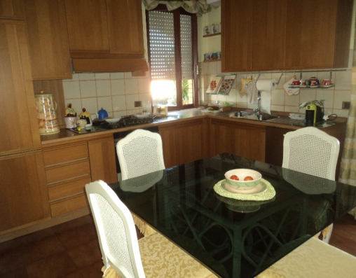 L’appartamento presenta pavimentazione in gres porcellanato, mentre i rivestimenti di bagno e cucina sono realizzati in monocottura. Gli infissi interni ed esterni sono in legno, con tapparelle scorrevoli in PVC di colore bianco, azionate elettricamente.