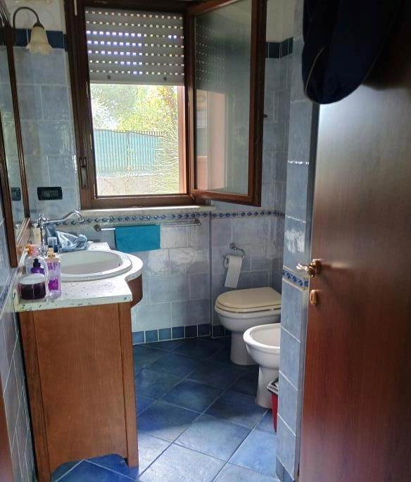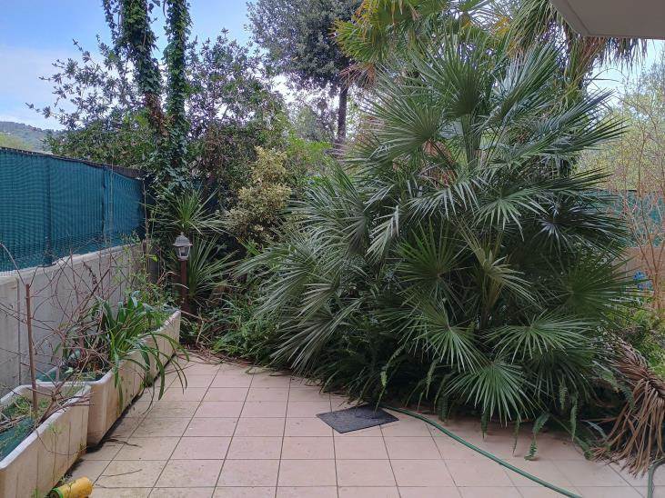 La corte esterna, di pertinenza esclusiva dell’appartamento, è suddivisa tra una zona pavimentata e una parte a verde piantumata, che tuttavia necessita di manutenzione ordinaria. L’unità risulta arredata e abitabile, ma presenta modesti segni di usura e richiede interventi di manutenzione agli infissi e al giardino.