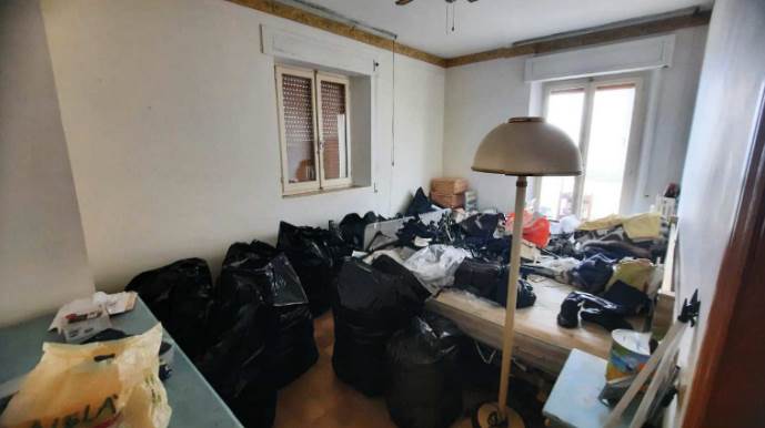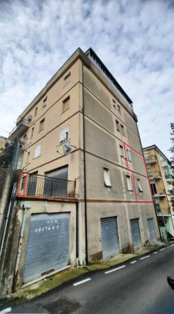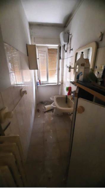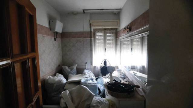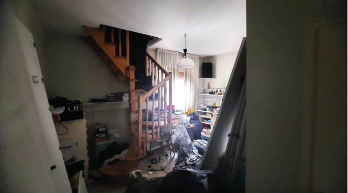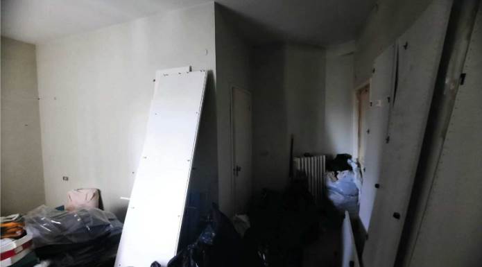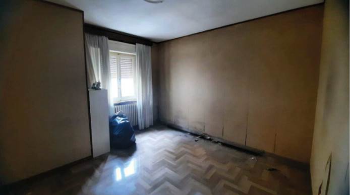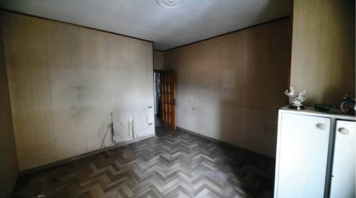 L’appartamento al piano terra rialzato, è composto da soggiorno con angolo cottura, due camere da letto, un bagno, due corridoi e un balcone chiuso con struttura fissa in alluminio e vetro, oltre al vano scala interno che collega al piano sottostante. Al piano seminterrato si trovano un locale pluriuso e un secondo bagno. Le finiture interne sono modeste: l’ingresso avviene da un portoncino in legno tamburato attraverso la scala condominiale; i pavimenti sono in marmo nella parte principale dell’appartamento, in parquet nella camera nord e in piastrelle di ceramica nella camera sud, nei bagni e nel locale pluriuso; gli infissi esterni sono in legno con vetro singolo, protetti da tapparelle in PVC e controfinestre in alluminio. Le porte interne risultano in parte in legno massello vetrato e in parte in legno tamburato impiallacciato. L’unità risulta attualmente distaccata dalle utenze e non è stato possibile verificare il funzionamento degli impianti. Il riscaldamento è privo di caldaia, non vi è impianto di climatizzazione e gli impianti risultano realizzati sottotraccia.