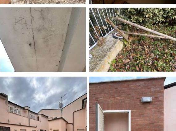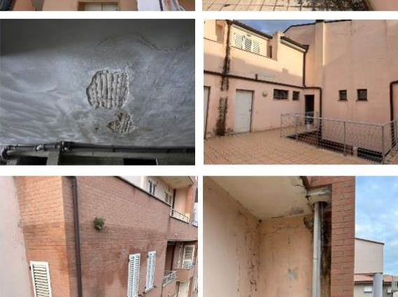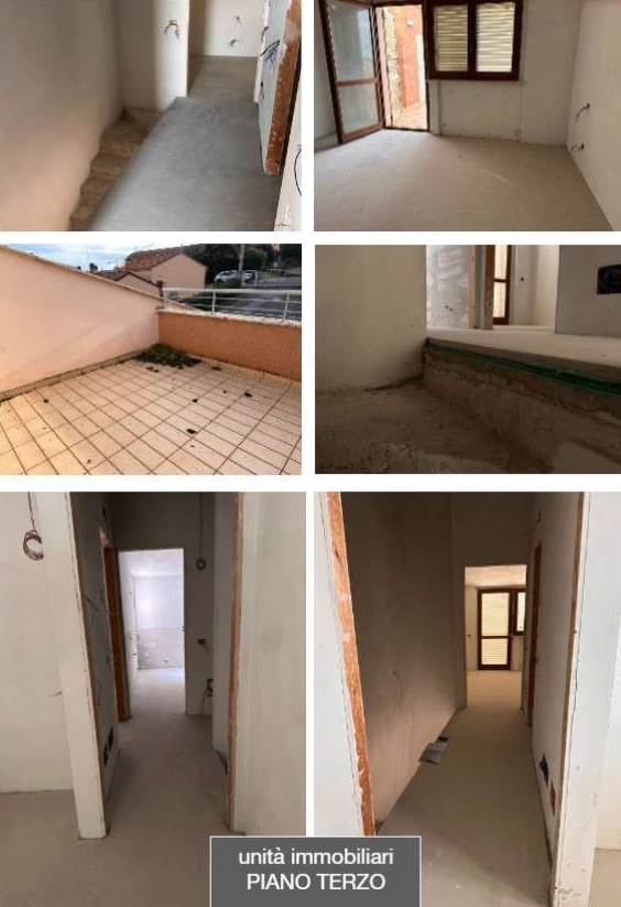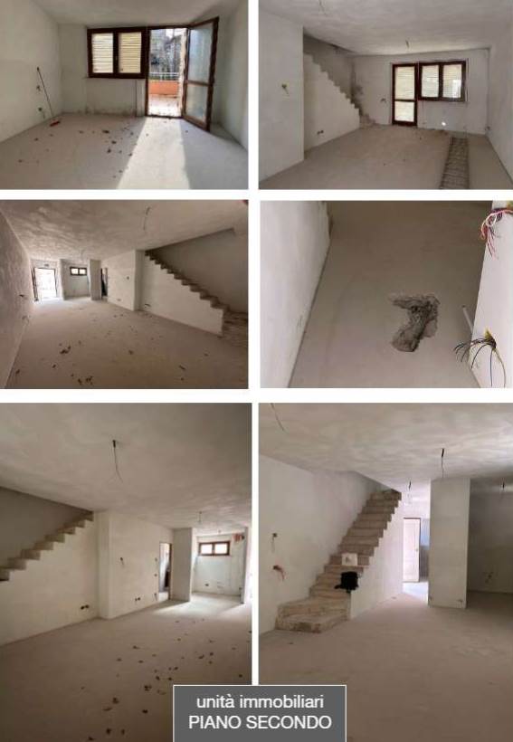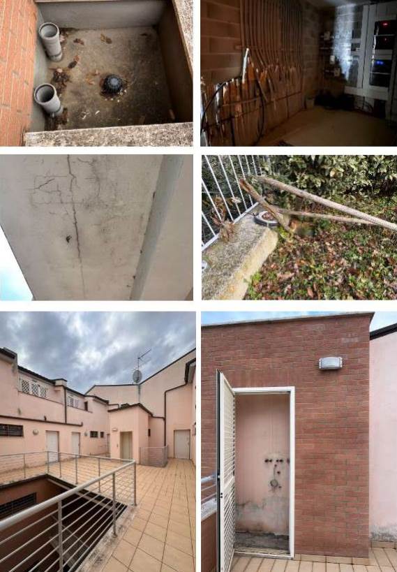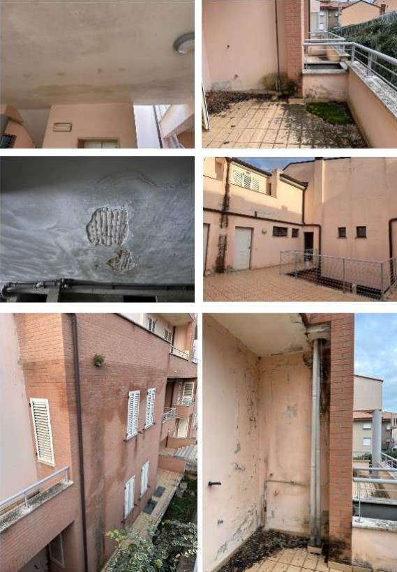 Il complesso si trova in zona collinare e gode di un’ottima panoramicità; le unità si trovano allo stato grezzo avanzato. L’edificio costruito nei primi anni 2000 si sviluppa su cinque livelli di cui uno completamente interrato, ha una struttura in c.a. con tamponatura esterna in parte a mattoncini a vista ed in parte intonacato; lo stato conservativo globale del fabbricato è complessivamente buono in relazione allo stato avanzamento dei lavori. Il condominio presenta varie problematiche dovute per la maggior parte ad infiltrazioni sui balconi/terrazzi e smaltimento delle acque meteoriche. Su tutti i prospetti sono presenti, sulle facciate, grandi macchie e fessure di intonaco. Necessitano lavori di rinterro di porzione dei prospetti e la realizzazione di una pergola sull’ultimo piano del vano scala, al fine di rendere il fabbricato conforme a quanto riportato negli elaborati grafici autorizzati. Tutto il piano interrato (garage), risulta essere privo di finiture ed infissi, come necessitano opere di completamento degli impianti condominiali.